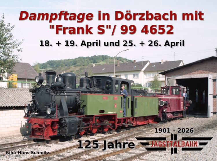 Im Jahr 2026 jährt sich die Betriebsaufnahme der Jagsttalbahn im Jahr 1901 zum 125. Mal. Dies werden wir mit verschiedenen zusätzlichen Attraktionen feiern. Allem voran wird an den Wochenenden 18. und 19. sowie 25. und 26. April die Dampflokomotive “Frank S” in Dörzbach zu Gast sein. Die Lok, die auch schon in den 80er-Jahren bei der Jagsttalbahn im Einsatz war, ist heute auf Rügen beheimatet und wird von der Preßnitztalbahn betreut, welche es freundlicherweise ermöglicht, die Lokomotive an uns zu vermieten.