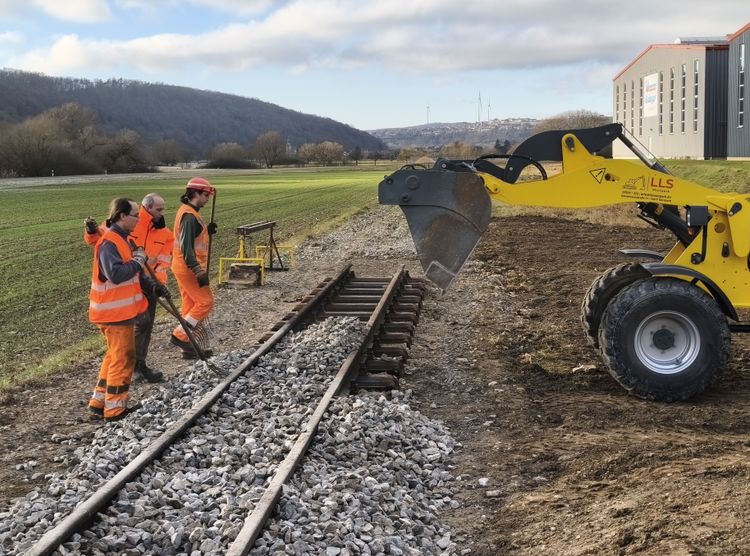 Zwischen Weihnachten und Neujahr haben wir das erste Joch hinter dem Bahnübergang geschottert und gestopft, sodass es befahrbar ist. Da der Bahnübergang auf der endgültigen Höhe, das Planum dahinter aber noch deutlich niedriger lag, haben wir Schotter aus dem Schotterwagen in die Radladerschaufel gefüllt und so das erste Joch geschottert. Anschließend konnte mit der Stopfmaschine eine Rampe gestopft werden, sodass der Bauzug nun in Richtung des nächsten Abschnitts fahren kann.