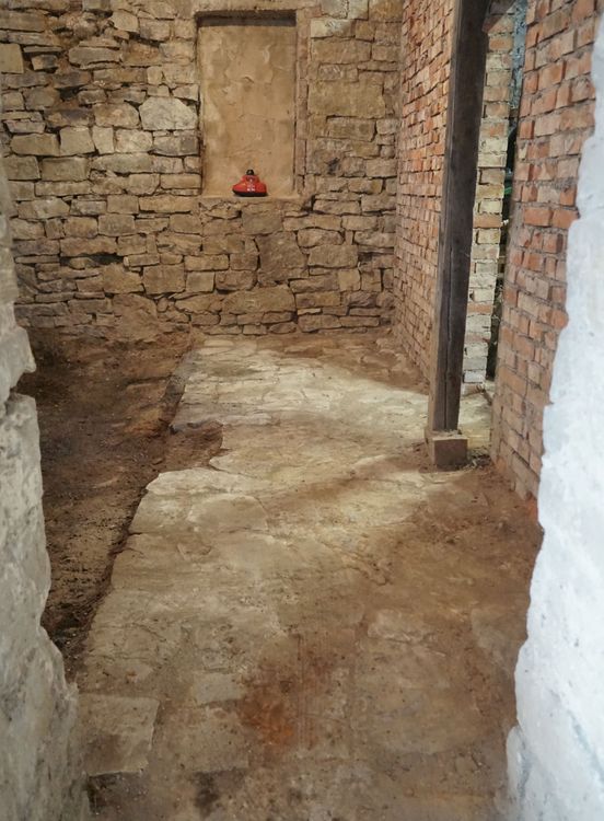 Der alte Boden war in zwei Teile geteilt: Im Bereich zum Hauptgebäude ist ein Natursteinboden, der nur an ein paar wenigen Stellen angepasst werden musste und ansonsten unter dem neuen Boden erhalten bleibt. Die andere Seite war früher durch eine zusätzliche Wand abgetrennt und diente als Übernachtungsraum für den Nachtheizer. In diesem Bereich waren Holzschwellen direkt auf den Boden gelegt. Diese waren nur noch in Fragmenten vorhanden und wurden entfernt. Stattdessen wurde hier mit KFT aufgefüllt.