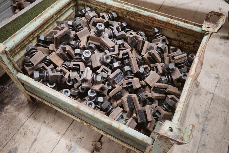 Zuletzt haben wir für den jetzt anstehenden Gleisbau viele Kleineisenpäckchen gepackt, d.h. jeweils Hakenschraube, Klemmplatte, Federring und Mutter zusammengesetzt.