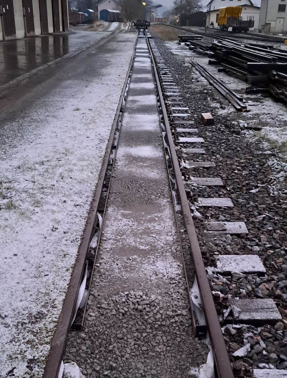 Heute wurde im Gleis 4 der einzudeckende Bereich zwischen den Schienen mit KFT verfüllt und verdichtet. Anschließend wurde noch das letzte Woche im Anbau des Reparaturhauses eingebaute KFT ebenfalls verdichtet.