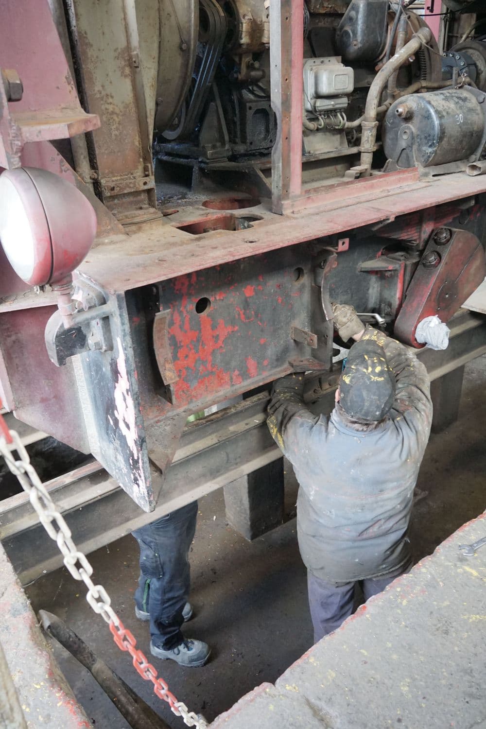 Heute ging es an einigen Baustellen voran. An der Diesellok 22-03 wurden im Reparaturhaus (mit geräumiger Grube) Vorbereitungen getroffen, um die Lok ausachsen zu können. Dafür wurden unter anderem Luftbehälter und das Bremsgestänge ausgebaut.