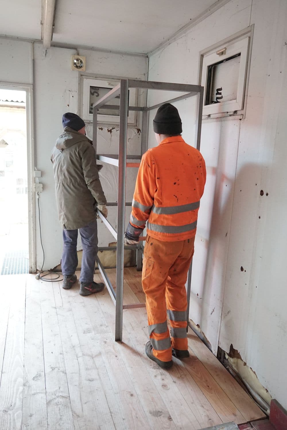 Am Lattenschuppen konnte wegen der frostigen Temperaturen leider immer noch nicht betoniert werden. Dafür wurde nach erfolgter Sanierung des Fundaments auf der Rückseite des Gebäudes der Stumpf der Weide vollends entfernt und das in diesem Bereich beschädigte Dach mit neuen Latten und Ziegeln repariert. Im benachbarten Container haben wir im vorderen Bereich einen neuen Boden eingebaut. Bereits letzte Woche waren die Zwischenwände, die die ehemaligen Sanitärzellen abgrenzten, ausgebaut und der alte, teils schon halb durchgebrochen Boden entfernt worden. Auf den neuen Boden aus Resten der Wartesaal- und Küchensanierung wurde sogleich ein Regal gestellt.