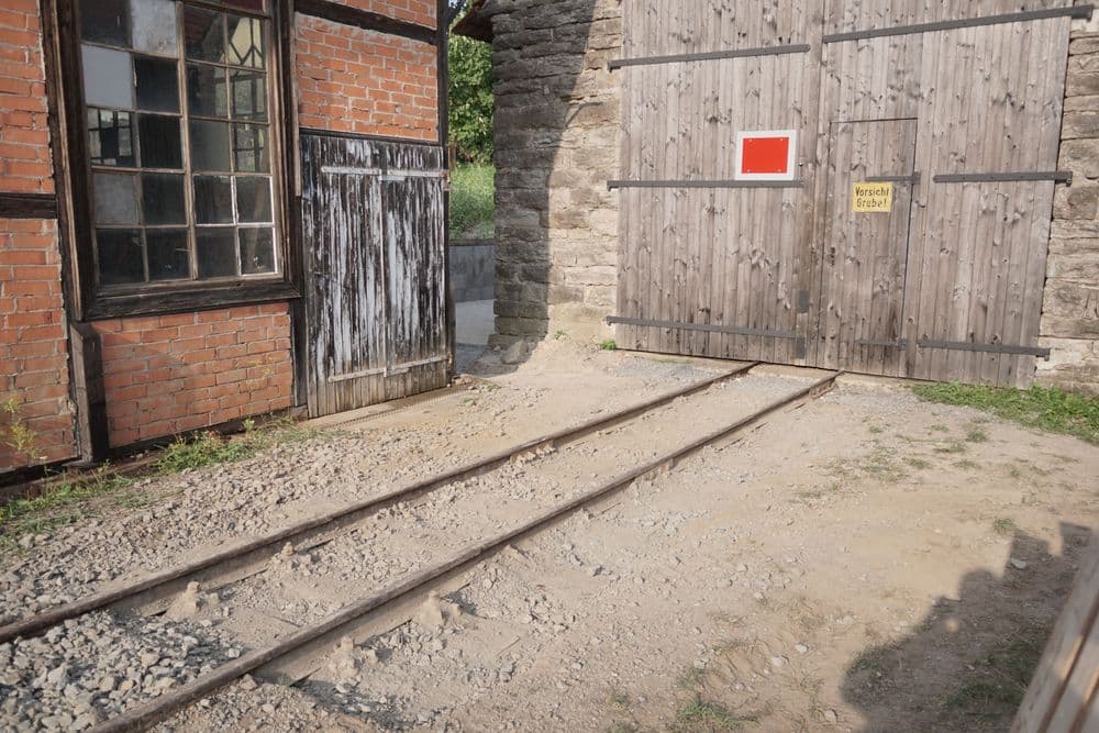 Nachmittags haben wir vor dem Reparaturhaus begonnen, das bisher mit Schotter eingedeckte Gleis bis zu den Schwellen freizulegen, um hier wie vor dem Lokschuppen eine gepflasterte Fläche anlegen zu können. Diese soll später die hintere Werkstatttür mit Reparaturhaus, dessen Anbau und Lattenschuppen hubwagengängig verbinden. Dafür wurden auch die in diesem Bereich liegenden Stöße verschliffen.
