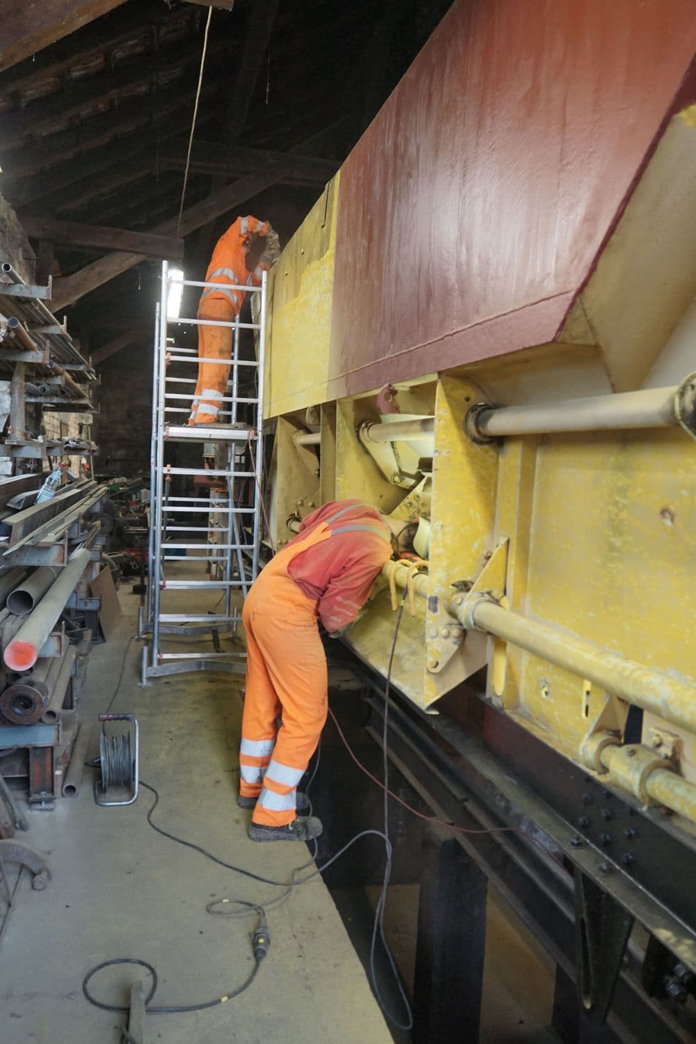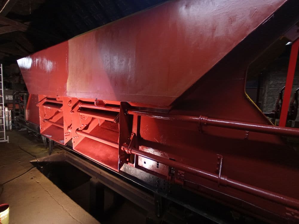 Außerdem wurde der Schotterkorb, der zwischenzeitlich auf einem Flachwagen gelagert war, wieder abgeladen, um ihn für den Einbau vorzubereiten. “Nebenher” haben wir noch mit den jährlichen Fristuntersuchungen an den Wagen, zunächst dem Wagen 435, begonnen, um die Fahrzeuge in der kommenden Fahrsaison wieder einsetzen zu können.