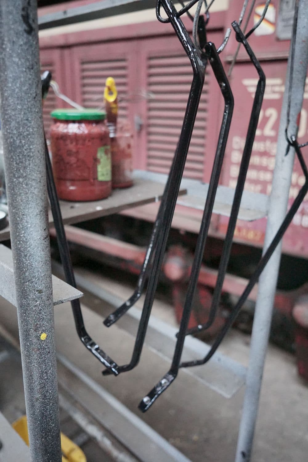 In der Werkstatt wurden für die Holzbänke im Wartesaal nach Vorlage kleine Metallhalter angefertigt und lackiert, die die Füße gegenüber der Sitzfläche abstützen.