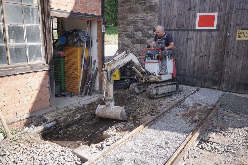 Außerdem wurde an der neuen Pflasterfläche zwischen Lokschuppen und Reparaturhaus gearbeitet: Die Fläche vor dem Werkstatt-Eingang hinten am Lokschuppen wurde ausgekoffert, ein Vlies wurde ausgelegt und die Tragschicht eingebaut und verdichtet. Durch die vielen Höhen-Fixpunkte von Gleis, Reparaturhaus-Tor und Werkstatteingang sowie durch die Bedingung, dass das Regenwasser nicht zu den Gebäuden hinfließen soll, war die Planung der Höhen keine ganz einfache Aufgabe. Am Abend wurden dann noch passende Randsteine aus unserem Fundus herausgesucht, zu der Baustelle gefahren und eingebaut.