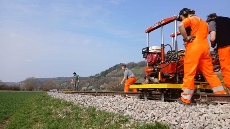 Auch diese Woche haben wir wieder an den zahlreichen Baustellen gearbeitet. Bereits am Freitag haben einige Mitglieder entlang des aktuellen Bauabschnitts gearbeitet. Dort wurde die Richtung der Geraden hinter dem Bahnübergang sowie im Bereich des "Lückenschlusses" zwischen früherem Streckenende und Bahnübergang mit der Schwungramme final ausgerichtet. Danach wurden in diesem Bereich alle Schrauben maschinell angezogen. Außerdem haben wir einige Stöße verschliffen, die trotz guter Vorbereitung eine kleine Stufe oder Fehler in der Fahrkante aufwiesen. An einem Stoß kam eine Versatzlasche zum Einsatz.