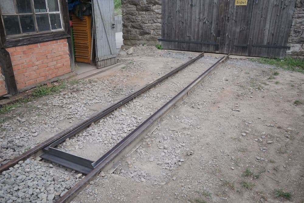 Vor dem Reparaturhaus ging es mit den Vorbereitungen für die Pflasterarbeiten weiter, indem die Rillenbeischienen montiert wurden. Aufgrund verschiedener Schienenprofile in diesem Bereich waren recht umfangreiche Anpassungen nötig.