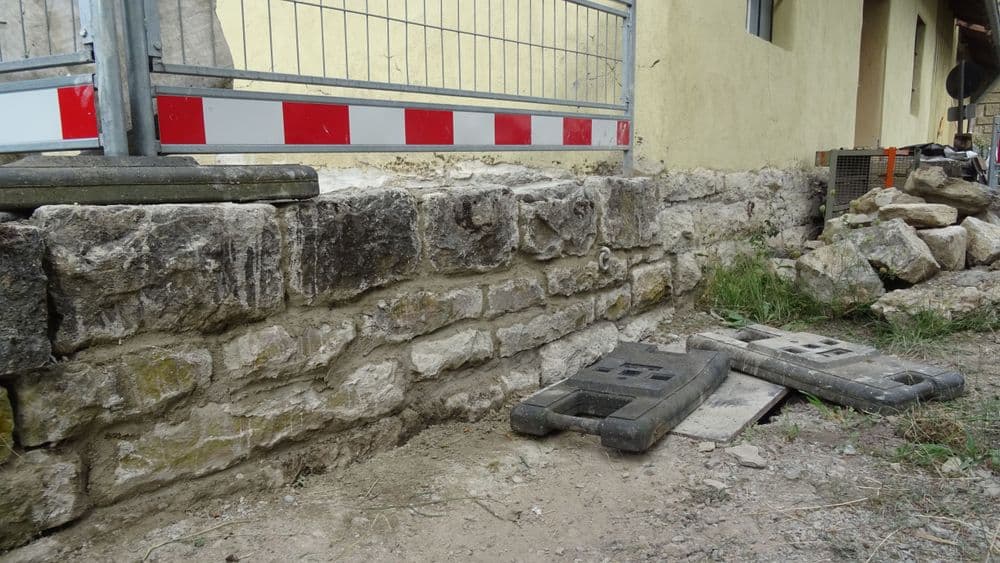 An der Milchzentrale (Anbau an den Güterschuppen) wurde die Laderampe wieder aufgemauert. Diese wurde an zwei Stellen abgebaut, als die Wand des Gebäudes zur Trocknung freigelegt wurde. Hier kann nun hinter einer schützenden Noppenbahn wieder aufgefüllt werden.