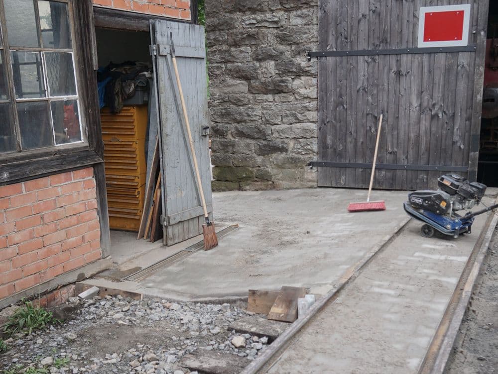 Heute konnten wir die Pflasterfläche zwischen Lokschuppen und Reparaturhaus fertigstellen. Auf der letzte Woche eingebauten Tragschicht wurde Splitt verteilt und gerade - bzw. den vielen Neigungen für die verschiedenen Fixpunkte entsprechend - abgezogen. Darauf wurden die Knochensteine verlegt, abgerüttelt und die Fugen mit Sand gefüllt. Später wird auch noch der Bereich auf der anderen Gleisseite zwecks Anbindung des Lattenschuppens folgen.