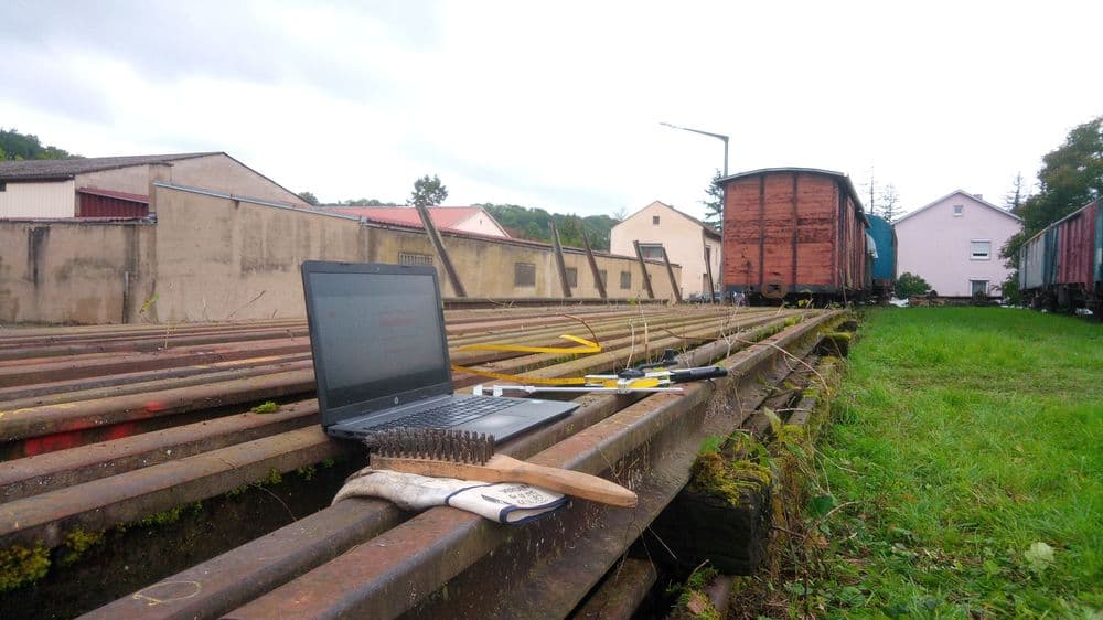 Außerdem haben wir die bereits vermessene oberste Lage unseres Schienenvorrats vom jetzigen Stapel herunter genommen und nebenan zur Durchführung der Vorbereitungsarbeiten abgesetzt. Dadurch war die nächste Lage des Stapels zugänglich, wo nachmittags die nächsten 15 Schienen begutachtet und vermessen wurden. Da es sich um gebrauchte Schienen handelt, ist die Höhenabnutzung teils sehr unterschiedlich, was bei der Verlegereihenfolge beachtet werden muss. Dazu kommen teilweise Schadstellen, alte Thermit-Schweißstellen, Knicke oder Bögen sowie unterschiedliche Längen. All das hat Einfluss auf die Verwendbarkeit der Schienen und muss dementsprechend dokumentiert werden - und so darf auch mal heimisches Büro-Equipment Gleisbau-Luft schnuppern.