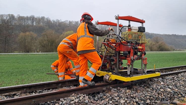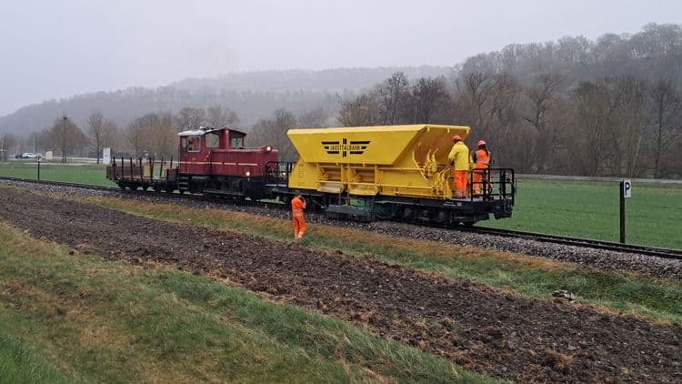 Auf der Gleisbaustelle konnte die etwa 100 m lange Gerade fast komplett auf Endhöhe gestopft werden. Ein daran anschließender, ca. 80 Meter langer Bereich benötigt nur noch einen Stopfgang. Nachdem die Fristuntersuchung am Schotterwagen nachmittags beendet war, konnte dieser erneut geladen werden und ein gutes Stück am Ende des gebauten Gleises das erste einschottern.