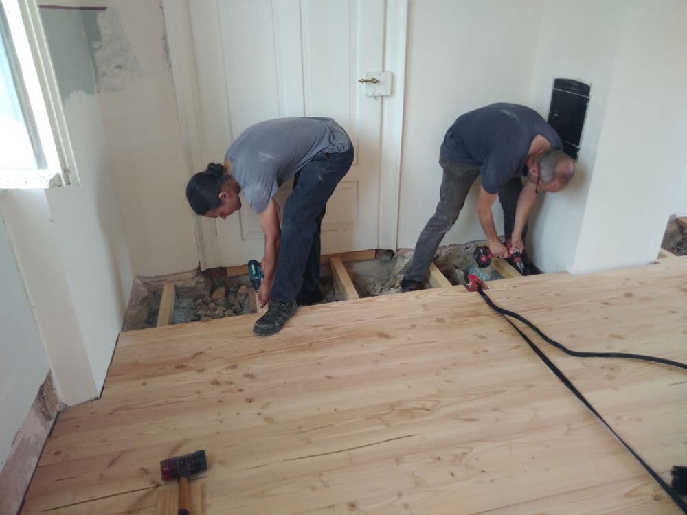 Heute haben wir an mehreren Baustellen gearbeitet. Im Wartesaal konnte der neue Holzboden bis auf die letzten zwei Bretter, die den Abschluss zur Wand bilden, eingebaut werden. Diese letzten Bretter erfordern viel Anpassungsarbeiten an die Wand, die Türen und den Kamin.