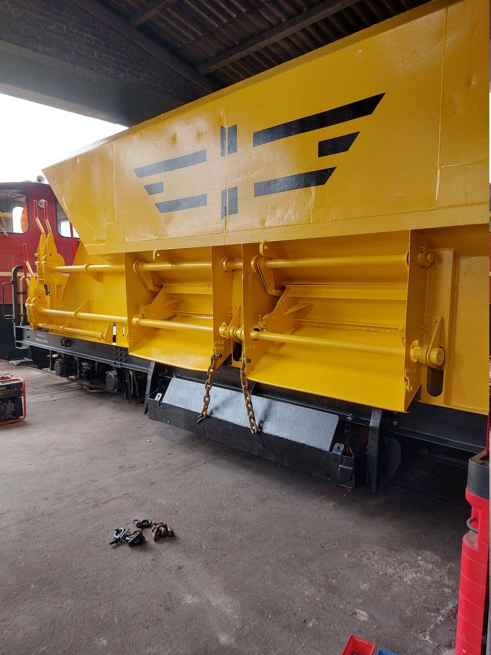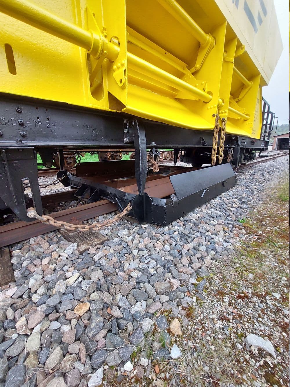 Außerdem wurde der Schotterkorb eingebaut. Nachdem der Wagen im Lokschuppen bereit stand, sollte der Schotterkorb mit zwei Hubwagen und auf Rohren als Rutschhilfe unter den Wagen geschoben werden. Trotz anfänglicher Bedenken rutschte der Schotterkorb in Rekordgeschwindigkeit unter der Wagen, wo er sogleich in die Seile zum Anheben eingehängt wurde. Danach wurden die vier Dorne am Rahmen befestigt, die den Schotterkorb beim Anheben in eine definierte Postition führen.