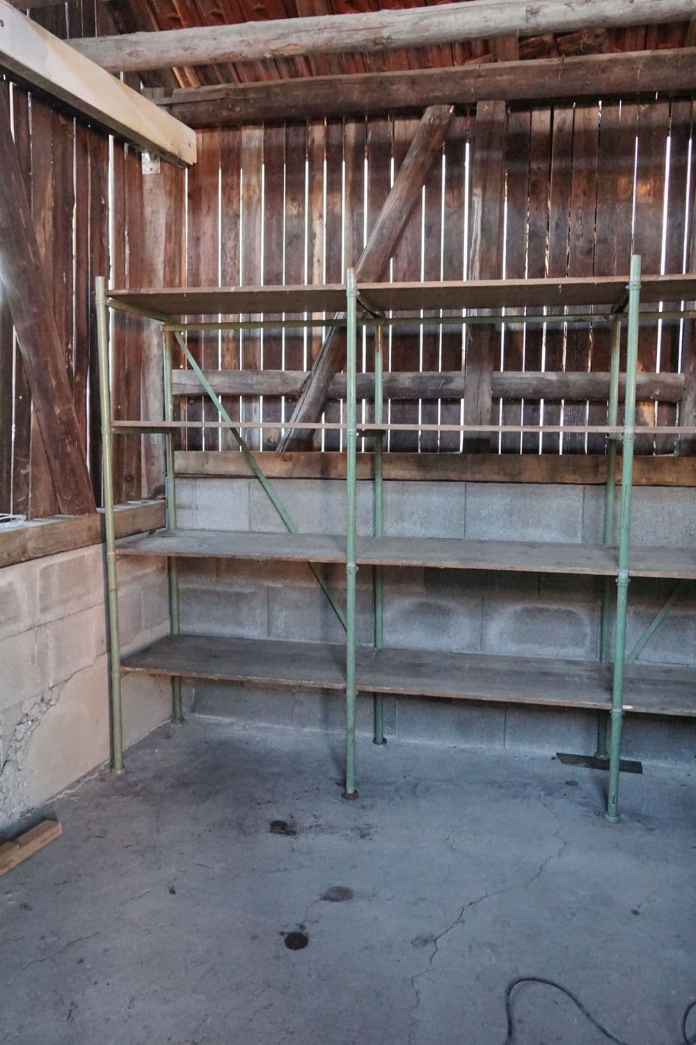 Heute ging es am Lattenschuppen weiter. Das Gebäude ist innen durch eine Trennwand in zwei Bereiche geteilt. Da der erste Teil nun (bezogen auf das Fundament) fertiggestellt ist, wurde der andere Bereich ausgeräumt und so Platz für die weiteren Fundamentarbeiten geschaffen. Um alles wieder geordnet einlagern zu können, wurde im fertigen Teil ein erstes Regal aufgestellt. Gleichzeitig haben wir in der südwestlichen Ecke des Gebäudes das Fachwerk für das neue Fundament vorbereitet und stabilisiert.