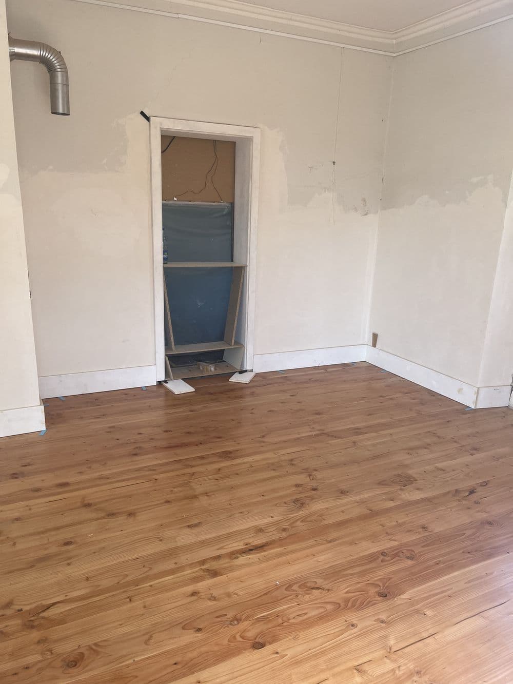 Im Wartesaal wurde in dieser Woche der neue Fußboden geschliffen und zweimal geölt. Am Samstag sind dann die Fußbodenleisten, die neuen Türschwellen und die Türfüllung für die Durchreiche zur Küche montiert worden.
