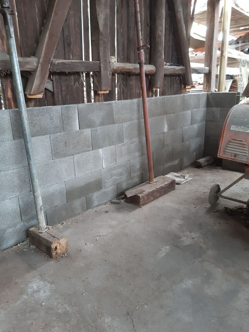 Auch am Lattenschuppen ging es weiter. Die Mauer auf der Südseite sowie um die Ecke auf die Westseite, die bereits in den unteren zwei Steinreihen betoniert ist, wurde auf Endhöhe gebracht und mit Bewährungseisen versehen. Der neue Grundbalken sowie die bestehenden Ständer wurden für den Einbau mit Zapfen und Zapflöchern versehen. Nun müssen wir leider erst auf wärmeres Wetter warten, um wieder betonieren zu können. Stattdessen wurde auf der Vorderseite der Lattenbeschlag wieder vervollständigt, ein neuer Anschlag für die Tür angebracht und die Funktion der Türriegel wieder hergestellt. Nach einiger Suche fand sich sogar ein Schlüssel, der für das Türschloss passend war, sodass wir den Schuppen nicht mehr wie bisher mit Kette und Vorhängeschloss abschließen müssen.