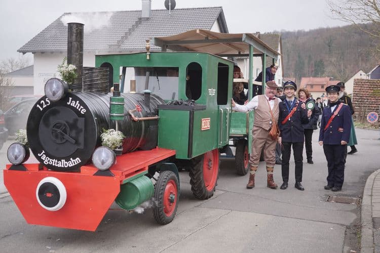 Diesen Samstag fand in Dörzbach der Frühjahrspferdemarkt statt. Anlässlich des 125-jährigen Bestehens der Jagsttalbahn baute eine Gruppe um unseren 2. Vorsitzenden Roland Volk ein sehr gelungenes "Zügle" mit der Dampflok Helene und zwei Wagen. In Uniform begleiteten wir den Wagen bei der Runde durch das Dorf und konnten zahlreiche Fahrpläne und Freifahrkarten verteilen.