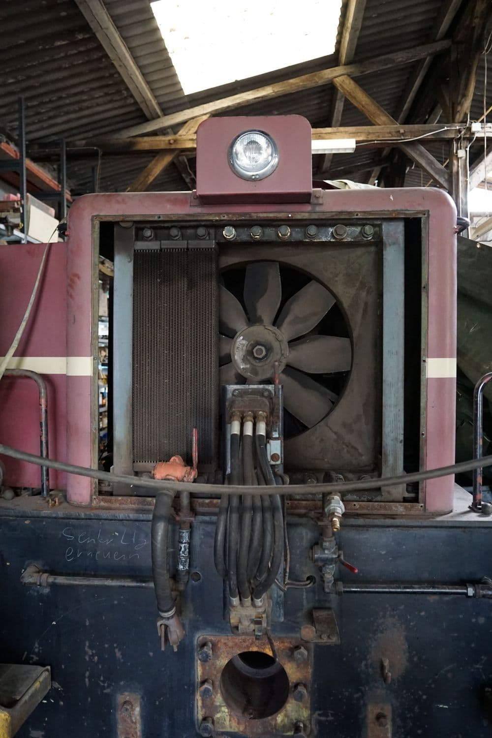 Auch an der Antriebsanlage, bzw. am Aufbau allgemein waren viele Arbeiten zu erledigen. Unter anderem Rohre und Schläuche ersetzen, Elektrik teilweise erneuern, oder wie im Bild zusehen die Kühlerelemente ausbauen um diese auf Dichtigkeit zu prüfen und wo nötig abzudichten.
