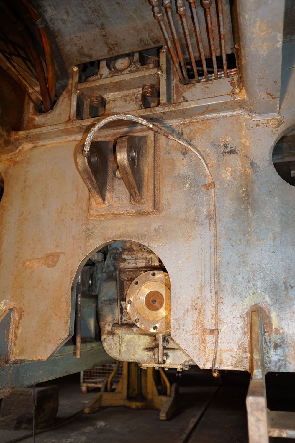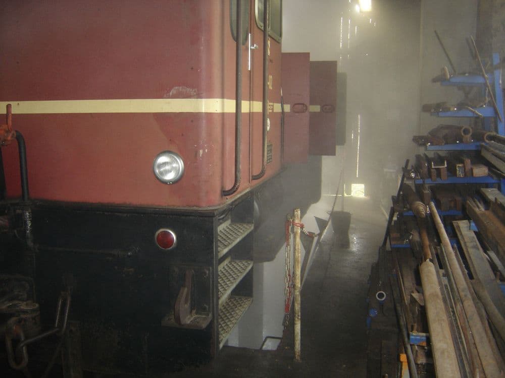 Bevor mit dem Ausbau von Komponenten begonnen wurde, wurde im Oktober 2014 das Fahrwerk der Lok bestmöglich mit einem Dampfstrahler gereinigt.