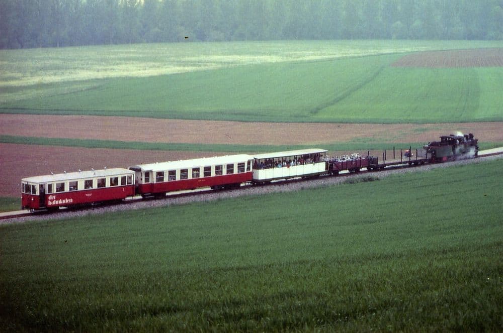 Bereits umlackiert ist M-D 402 während des Pfingstspektakes 1985 in einem Museumszug zwischen Schöntal und Bieringen unterwegs.
