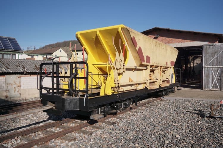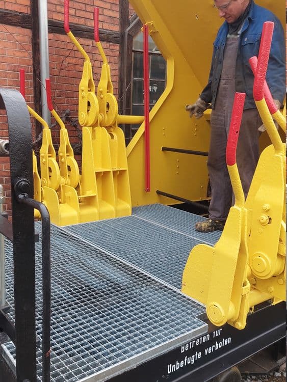 Bei Temperaturen knapp über dem Gefrierpunkt wurden in einer Bauwoche und kurz danach die Geländer und der Wagenrahmen, sowie die schmalen Seiten des Schotterwagens aufgeraut, grundiert und in einem weiteren Arbeitsgang final gestrichen. Die neuen Luftrohre an den Bühnengeländern, das Bremsgestänge und die Hubeinrichtung des Schotterkorbs konnten wieder eingebaut werden.