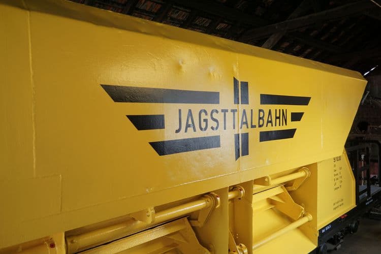 Im März folgten das Anschleifen, Grundieren und der finale Anstrich der beiden Längsseiten des Wagens und die Beschriftungen. Der Schottertrichter hat dabei auch beidseits das Flügelrad mit Jagsttalbahn-Schriftzug erhalten.