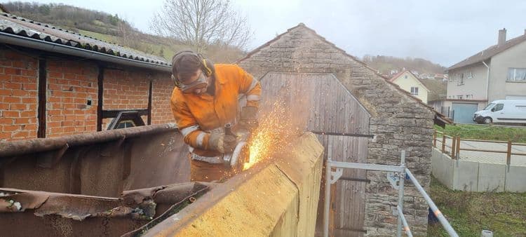 Am Aufbau ging es im Herbst mit den Bühnen weiter. Auf der einen Seite wurde der vorhandene Blechboden entfernt, da sich hier viel Dreck zwischen Rahmen und Blechen gesammelt hatte und den Rost dort stark förderte. Auf der anderen Seite war bisher kein Bühnenboden vorhanden. Da wir beide Seiten Nutzen wollen und auch auf beiden Seiten zum Besetzen der Spitze bei Rangierfahrten ein sicherer Stand nötig ist, wurde auch hier ein Boden sowie ein Geländer vorgesehen.